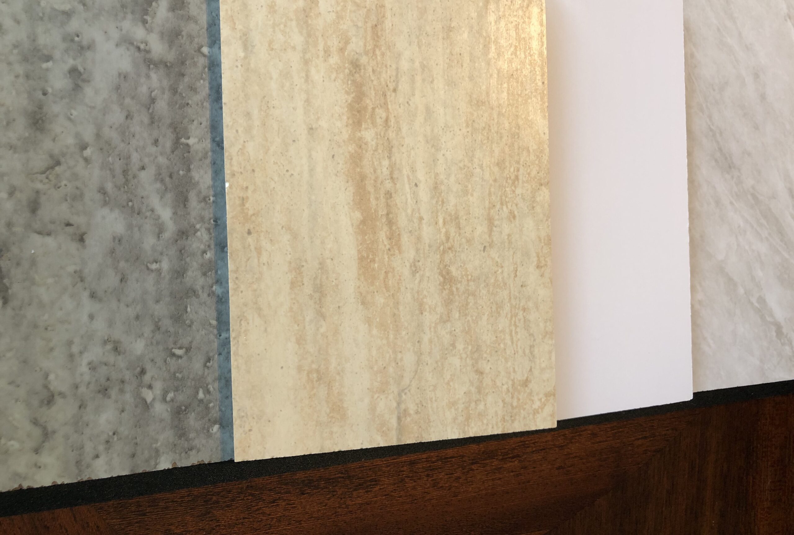 “Once the prep work is done, it’s somewhat like peel and stick,” Tesvich said of the Bella Core products. “That’s what the product does. It rolls up onto the wall. And it is real marble, real travertine that is being used. And, of course, the Poly system is a fabricated representation of this look.”